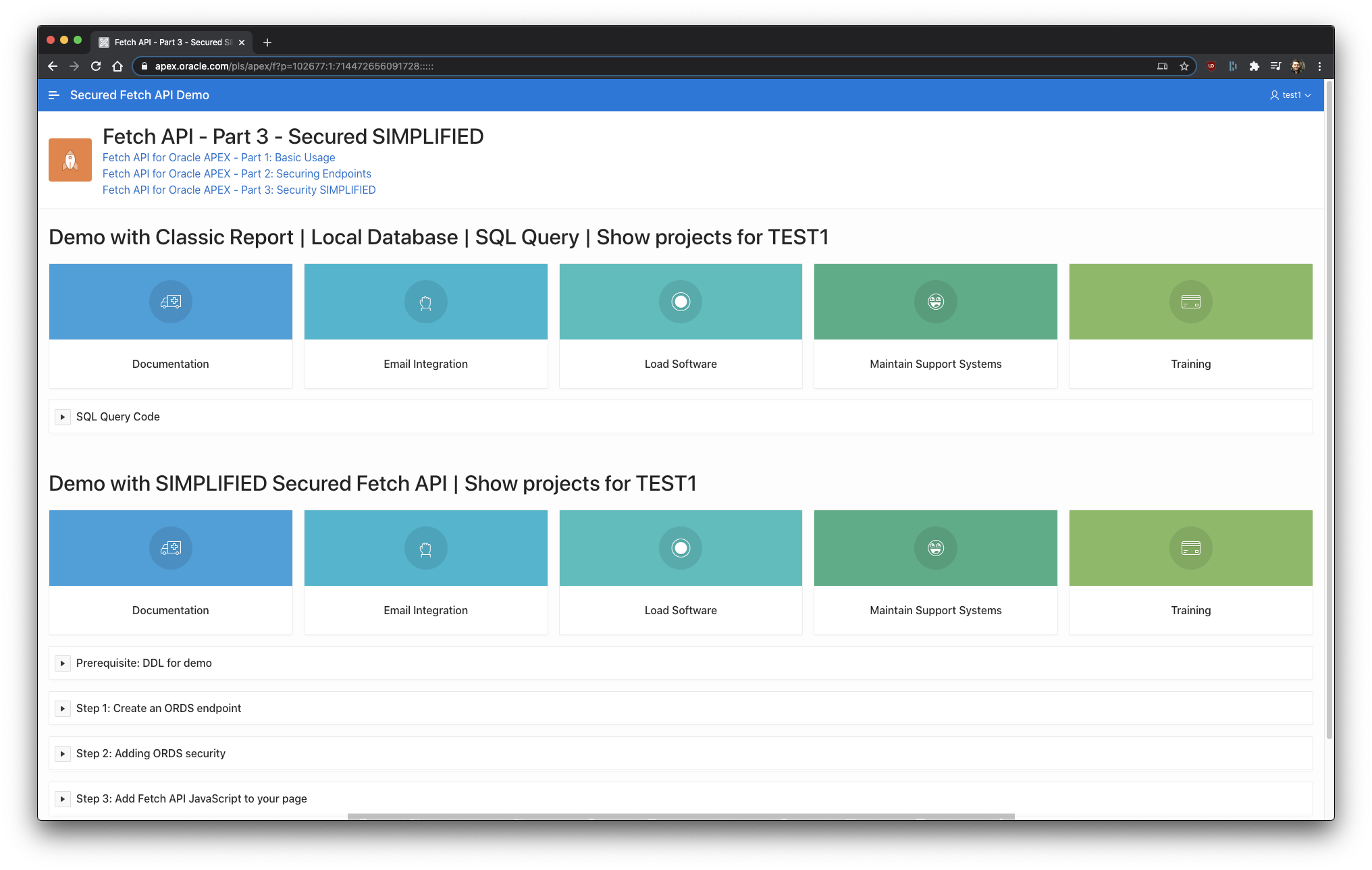 Here's my demo app for Part 3. Use login test1, test2 or test3 with any password. The goal of this app: Show different cards based on :app_user. The top region is a regular classic report and the bottom region is a secured Fetch API call.