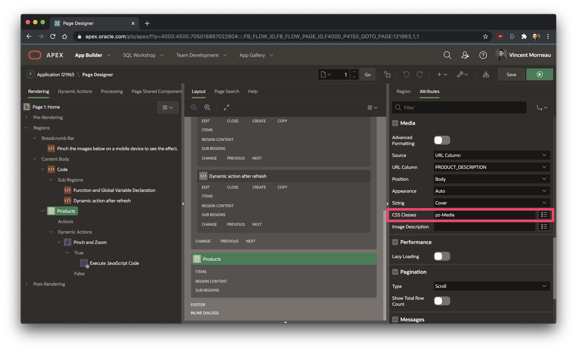 First of all, we need a mechanism to detect your fingers. APEX comes with a library called Hammer.js, which is used in some dynamic actions. We will leverage Hammer.js to detect pinching.